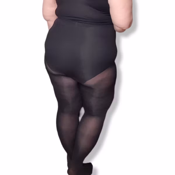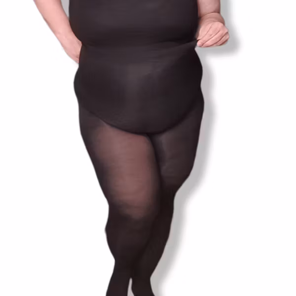 Strumpan är svart halvtäckande 50 den med extra bredd över låren. Byxdelen är transparant hela vägen upp till midjebandet.