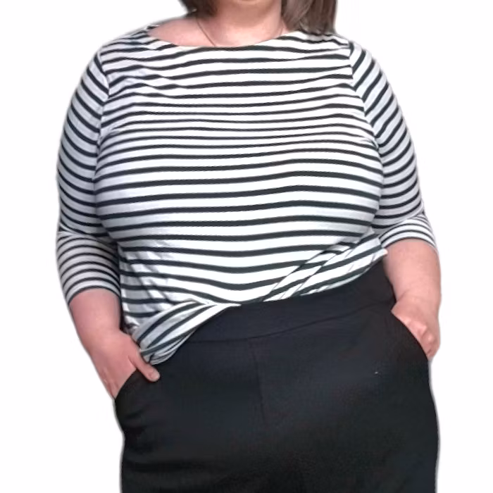 Vår modell i randig topp heter Helen, hon har storlek 52 och är 168 cm lång